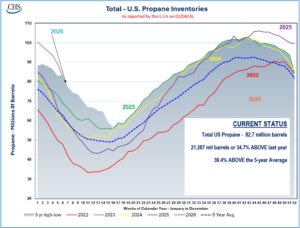 Near-term propane market fundamentals remain supportive, driven by continued seasonal demand and temporarily reduced production tied to freeze-offs. While freeze-related disruptions are expected to ease, inventory levels have already been tightened by recent draws.
